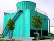 (7)吸聲設施:超低噪聲型冷卻塔在上塔體出風口上面安裝了帶吸聲材料的屏蔽及吸聲柵,降低了風機及電機的噪聲。對于小塔設蘑菇型吸聲柵。